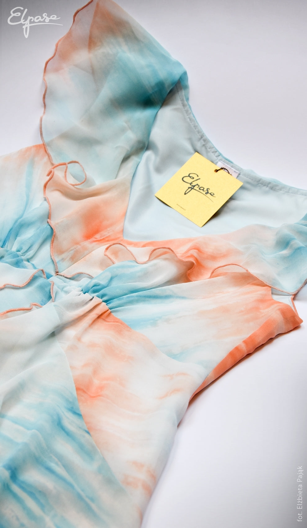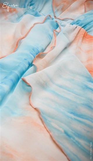 Feminine and fashionable chiffon combined with a pastel print in blue and orange colours. Looks even better in person! The V-neck beautifully emphasizes the bust and the flounce will cover the shoulders. Fully lined. The dress moves wonderfully and does not restrict movement. A delicate elastic band is sewn under the bust, adjusting the dress to the changing figure. You will also use this model after the baby is born.