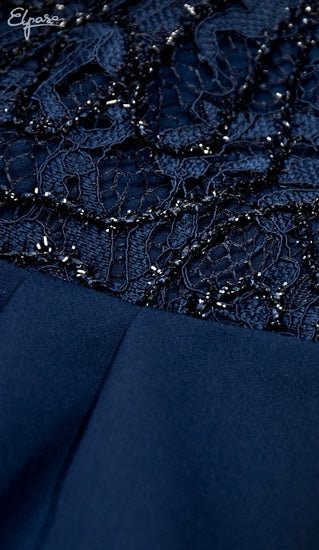 Phenomenal, sensual, inspiring OLENA. This pregnancy creation with a classic pencil cut and V-neckline is very feminine and sexy. An ideal proposition for special occasions. A simple, classic cut of a navy blue dress perfectly adapts to the pregnancy silhouette. The front of the dress is cut under the bust. The top of the front is made of slightly shiny navy blue lace, which emphasizes the attractiveness of the pattern. The slightly elongated arm gives the impression of sewing in tiny sleeves. The dress exposes feminine attributes and slims the figure.