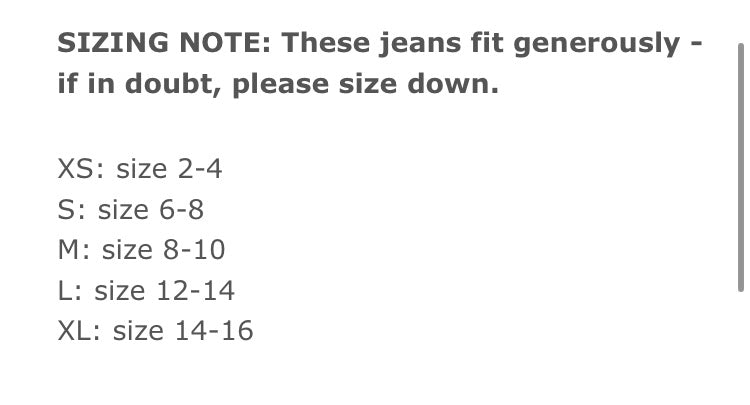 SIZING NOTE: Please note these jeans have a generous fit and depending on the fit you like, you may want to buy one size smaller than usual.