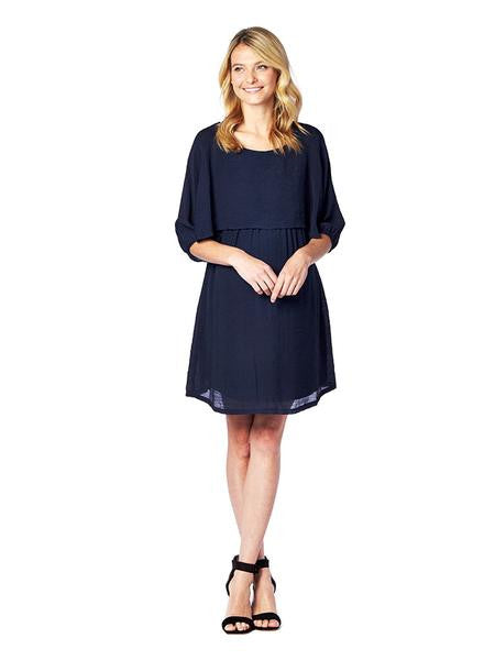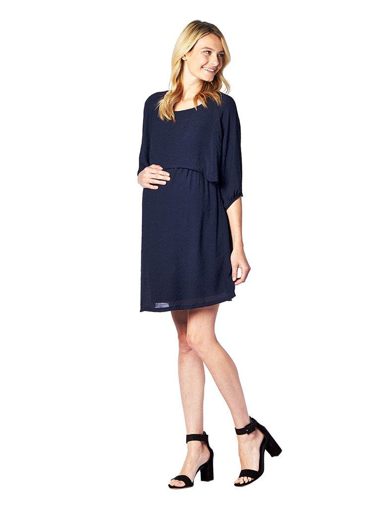 A beautifully draped, floaty maternity dress features a flattering overlay designed for ease of nursing once baby arrives. Please note the dress is the dark blue colour in image 2 and 3.