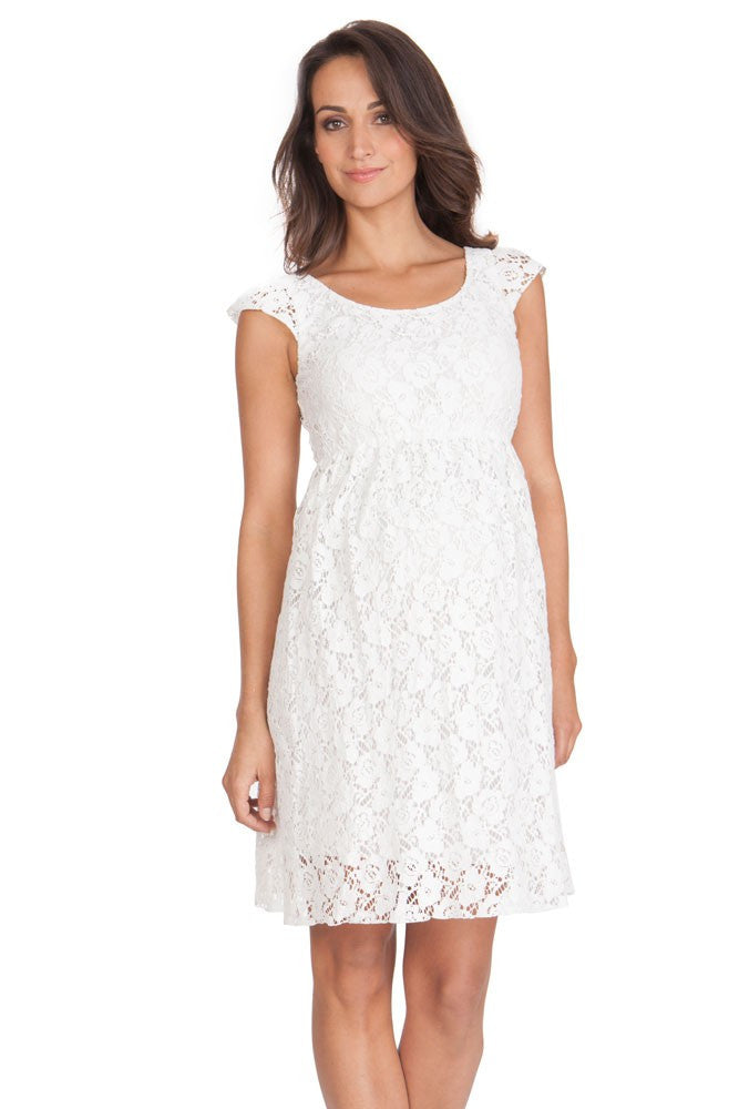 Feel divine in our beautiful white lace maternity dress. Made in soft stretch cotton lace, this white maternity dress is ultra-feminine, exuding a soft vintage charm. Cute capped sleeves and a flattering scooped neckline enhance the effect, while the gently elasticized empire waist highlights your slimmest point, creating a flattering silhouette for pregnancy. The easy-to-wear a-line skirt allows plenty of room for your growing curves, providing a perfect fit before, during and after your pregnancy. A fantastic choice for summer parties, simply add a belt to define your figure & some matching sandals to complete the look.