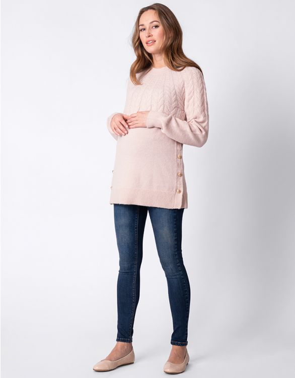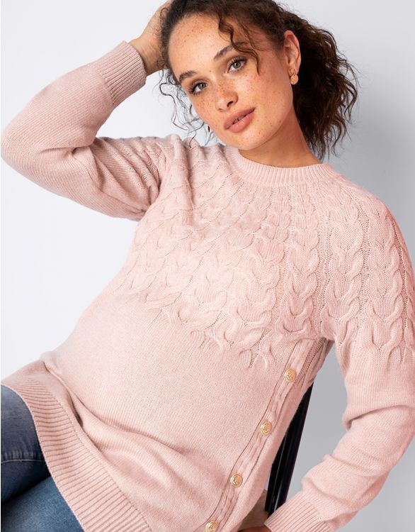 Ultra-soft & easy, our Blush Pink Maternity & Nursing Sweater is a must-have for your winter pregnancy. Cut long with plenty of stretch, this super-soft knit offers a flexible fit through nine months & beyond. Once baby arrives, the smart rose gold snaps open up at the sides for easy nursing access. Tactile cable knit detailing completes the look – team it with jeans or leggings for an easy everyday outfit.