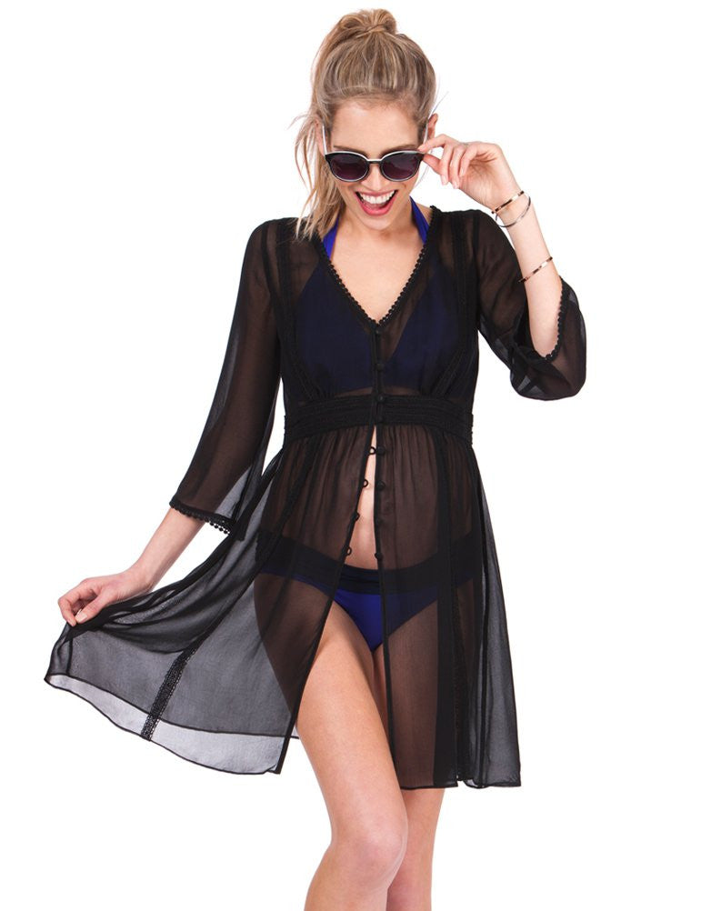 Add a touch of luxe to your summer repertoire with the Black Maternity Kaftan. Made in sheer woven viscose with matching lace trims, this piece is designed to slip on over your swimsuit, and can even be layered over shorts and a camisole for easy summer style. Gently elasticized at the back, the style nips in at the empire waist, then drapes beautifully over your curves, allowing plenty of room to grow. Featuring a flattering v neckline and sexy open keyhole back, this style is the ultimate in summer glamour.